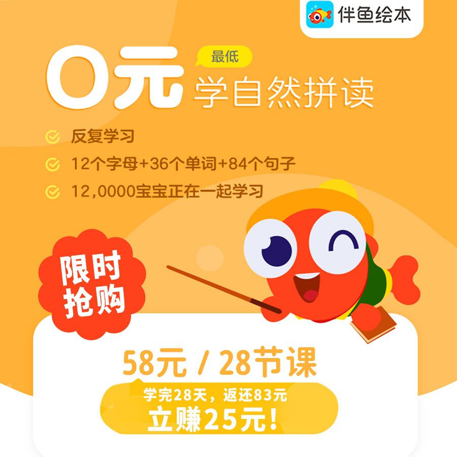【限时抢购 | 打卡0元学】伴鱼自然拼读28天L1精品课程,学完立赚25元!每天25分钟,培养孩子字母、发音、语感、拼读能力、阅读能力、艺术表达能力~
