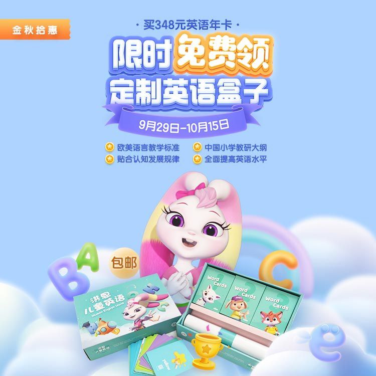 【9.29-10.15限时加赠英语定制盒子】洪恩儿童英语VIP年卡享21类主题课程,300个精选单词,100组核心句型,100首原创儿歌,50套常用对话,50本分级阅读等~