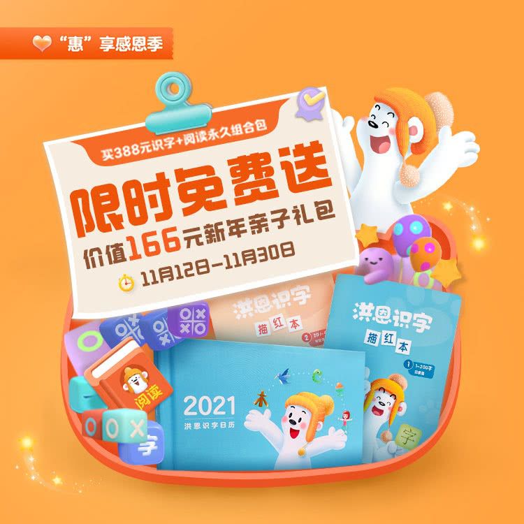 【11.12-11.30 限时加赠166元新年亲子礼包】388元超值抢购!洪恩识字永久识字包+永久阅读包!专业分级阅读识字,让孩子轻松掌握1300个高频常用汉字!