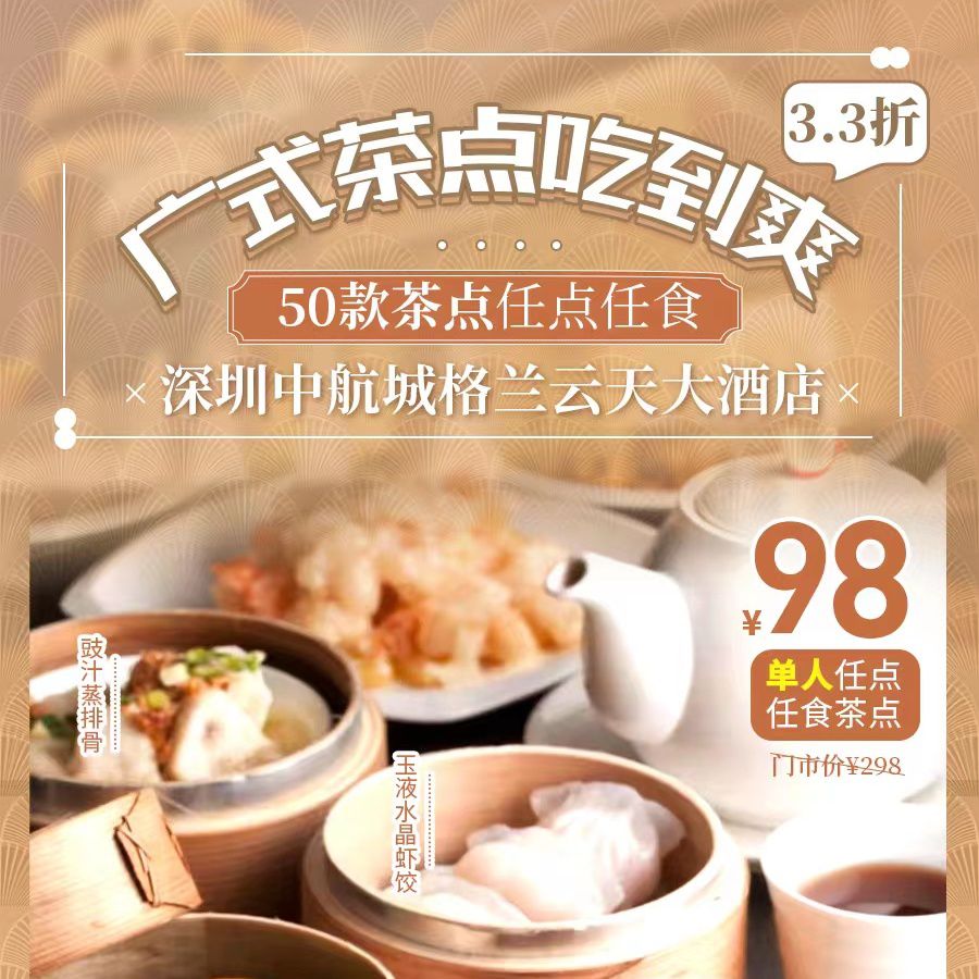 3.3折广式茶点吃到爽,位于福田华强商圈!98元【深圳中航城格兰云天大酒店】50款茶点任点任食!玉液水晶虾饺、酱汁蒸凤爪、豉汁蒸排骨...