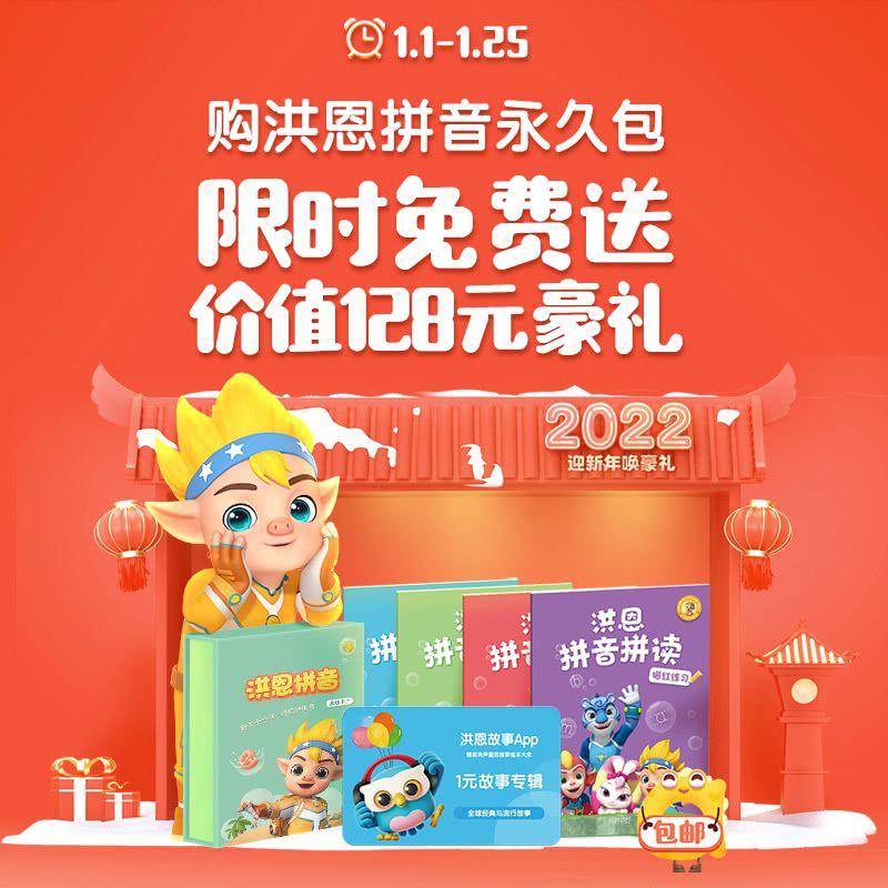 【迎新年1.1-1.25丨包邮送拼音卡+拼音练习册+1元故事专辑】洪恩拼音拼读永久包,拼音儿歌交互,锻炼孩子拼读、应用、书写等能力!