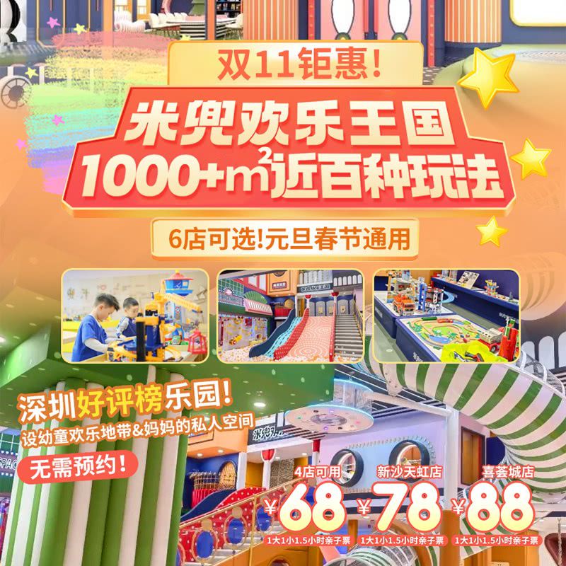 【米兜欢乐王国·6店可选】双11钜惠!¥68起/1大1小玩1.5h,元旦春节通用!深圳好评榜乐园,1000+㎡近百种玩法,设幼童欢乐地带&妈妈的私人空间!无需预约~