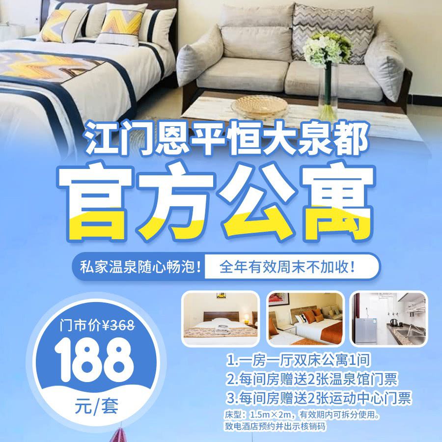 【全年有效周末不加收】188元/间!三天两夜仅需299元!入住异国风情的温泉小镇,恩平恒大泉都官方公寓+温泉票+运动中心!泡冷热温泉池,享冰火两重天 ,度假计划安排上!