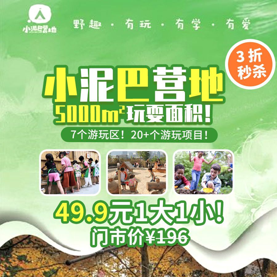 3折秒杀!开业预售仅49.9元1大1小玩转深圳5000m²『小泥巴营地』!一票解锁7大游玩区,20+项目,多种角色扮演挑战不同路线,融入动漫IP原创游戏剧本,开启创意新玩法!