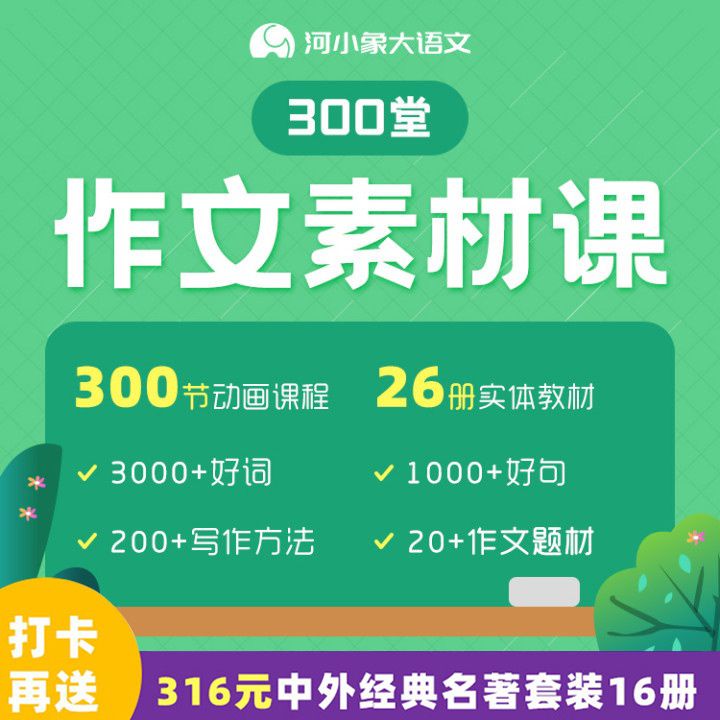 【包邮送26册配套实体教材,打卡再送中外名著套装16册】河小象300堂作文素材课 | 适合5-12岁,贴合国家教育部主编的“部编本”教材,每天15分钟,帮助孩子建立自己的写作素材库~