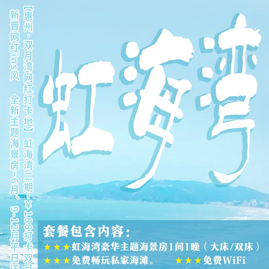 【有效期至2020年底】¥188入住惠东『惠州·双月虹海湾二期』豪华主题海景房1间/晚(大床/双床),免费畅玩私家海滩!出发~即刻打卡双月湾新晋网红ins风新地标~