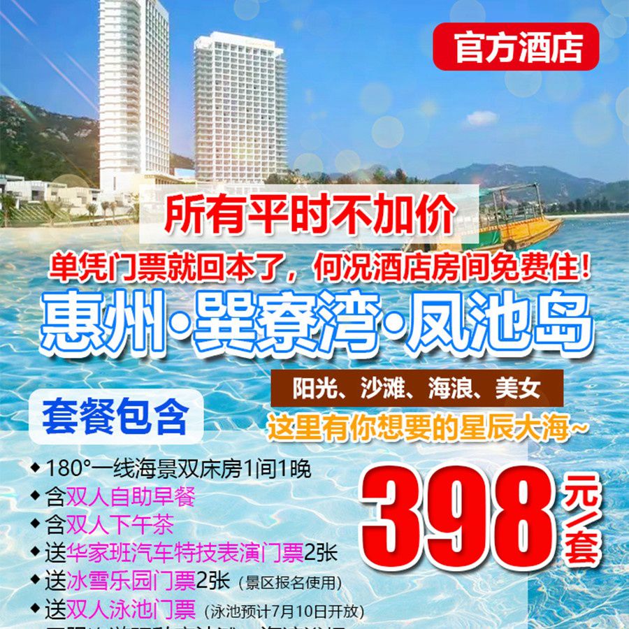 ¥398打卡巽寮湾·隐世小岛!入住『惠州·巽寮湾·凤池岛酒店』180°一线海景双床房1间/晚,品双人早餐+下午茶,无限次游玩私家沙滩、海滨浴场!下单立赠池+冰雪乐园+华家班汽车特技表演门票!