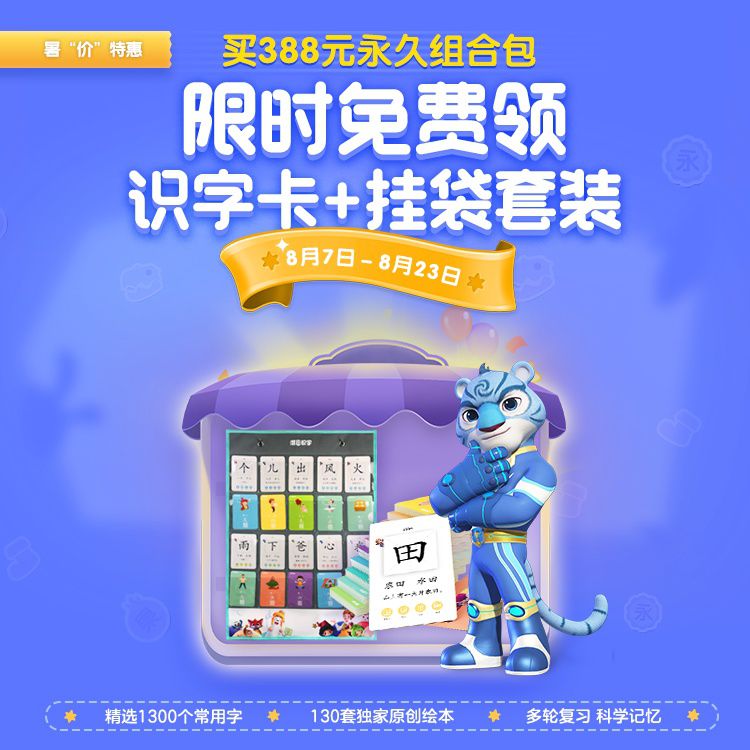 【8.7-8.23限时赠前100张识字卡+挂袋套装】388元超值抢购!洪恩识字永久识字包+永久阅读包!专业分级阅读识字,让孩子轻松掌握1300个高频常用汉字!配备高清、精美绘本丰富孩子想象力与阅读力~