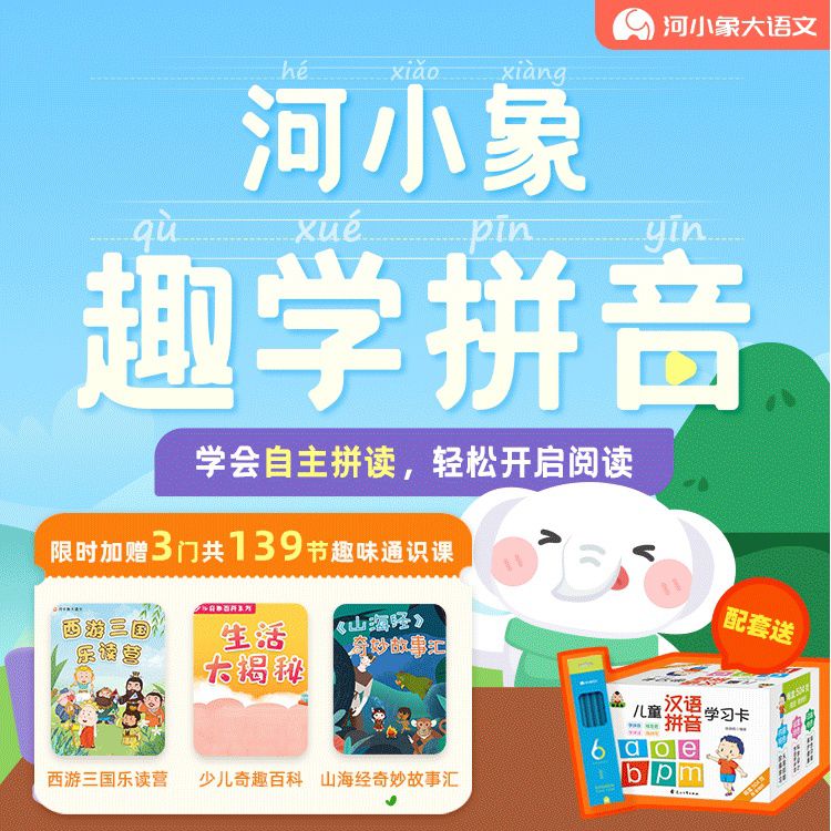 【新品上架 | 包邮配送儿童汉语拼音学习卡+练字专用铅笔】河小象带宝贝一起趣学拼音,附赠139节趣味通识课!用22天学会自主拼读,轻松开启自主阅读~