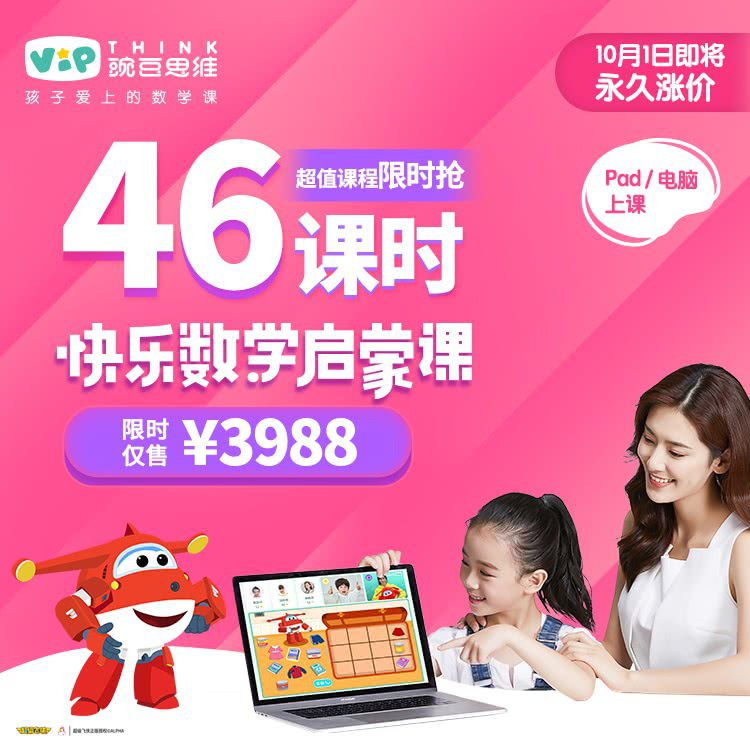 【10月1日永久涨价】VIPTHINK豌豆思维「中课卡」+ 侠侣独家福利 | 让孩子爱上数学!创新工场创始人李开复博士倾力推荐,适合3—8岁的在线直播数学课,课程结合超级飞侠,孩子们可喜欢啦~