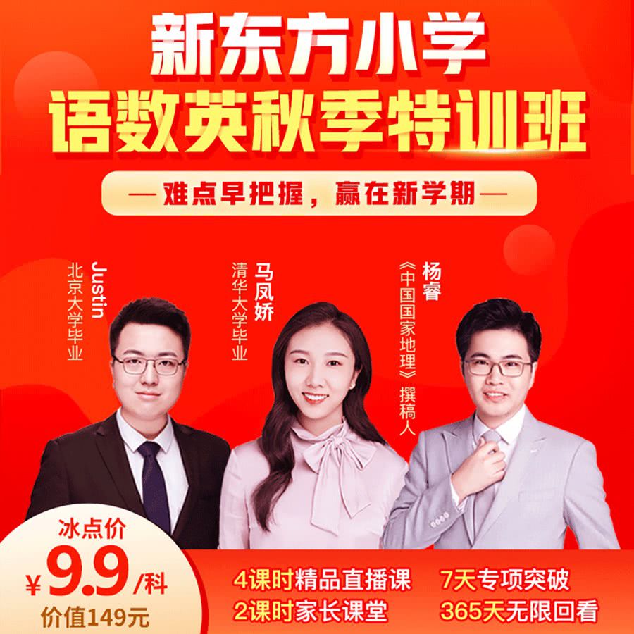 【9.9元/科】新东方在线清北名师秋季直播特训班,突破语/数/英学习重难点,全勤再送小学全科内部干货资料包!难点早把握,赢在新学期~