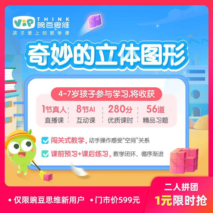 1元拼团抢 |「豌豆思维」侠侣独家《奇妙的立体图形》课程,8节趣味互动思维课+1节真人直播课,带宝贝解锁奇妙空间思维新世界!