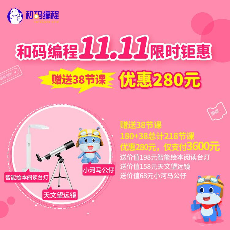 【双11钜惠,立省280元 | 限时加赠38节课】和码编程 180节 正式课,数学+编程双项兼顾,培养逻辑思维能力,下单再赠三重精美礼品!