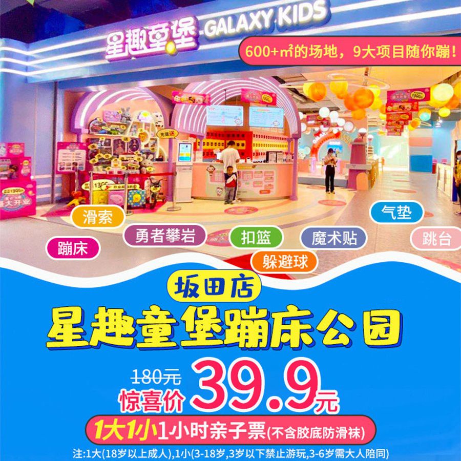 【龙岗星河WORLD COCO Park店】爆款回归!历史zui低价!39.9元抢600+㎡『星趣童堡蹦床公园』1大1小1小时亲子票,9大项目随你蹦,1小时畅玩,周末可用!