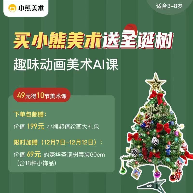 【12月7日-12日丨限时限量300套】专属福利,下单加赠60cm圣诞树!小熊美术少儿美育素养AI课堂,10节课+包邮赠199元超值绘画大礼盒+专属辅导老师,适合3-8岁!