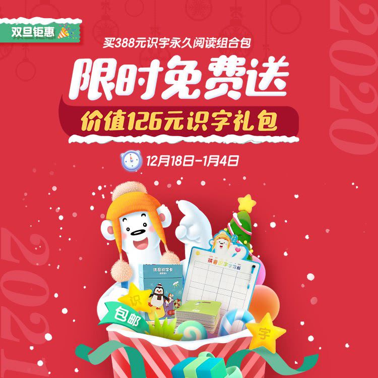 【12.18-1.4 限时赠价值126元识字卡礼包】双旦活动丨388元超值抢购!洪恩识字永久识字包+永久阅读包!专业分级阅读识字,让孩子轻松掌握1300个高频常用汉字!