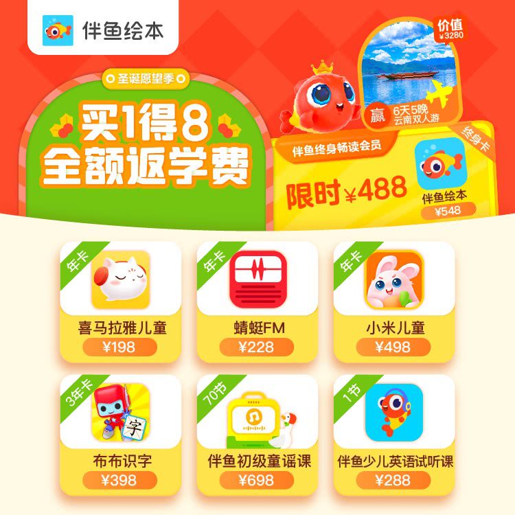 【圣诞愿望季 | 打卡0元享·每日抽奖】伴鱼终身绘本联合会员,买一得八!喜马拉雅儿童会员年会员、蜻蜓FM年会员、小米儿童年会员、布布识字3年会员、伴鱼童谣和少儿英语课程,孩子的圣诞礼物!