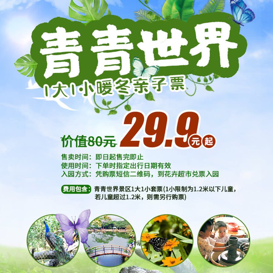 限量开抢!29.9元起抢80元青青世界1大1小亲子票:走进闹市里的仙踪密林,遇见热带雨林、侏罗纪、小动物……带上小朋友与大自然来个亲密约会~
