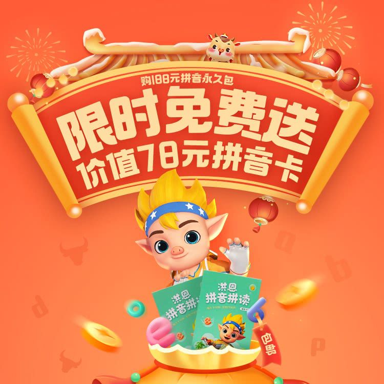 【新春特惠 2.1-2.22】限时加赠78元拼音卡丨洪恩拼音拼读永久包幼小衔接必备,一拼音一儿歌交互学习,科学语音测评系统,教学课程同步部编版小学语文课本!每天十分钟,让小朋友轻松上小学~
