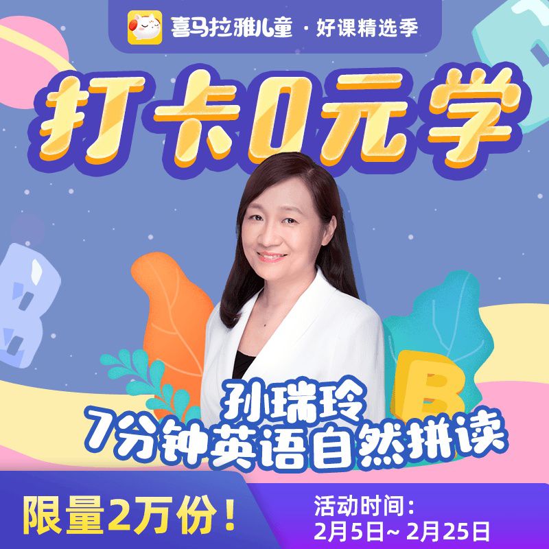 【打卡0元学】喜马拉雅儿童·孙瑞玲7分钟英语自然拼读,50期正课+50期赠送小课,4大等级层层递进,摆脱死记硬背的困境,掌握1000+英文单词!
