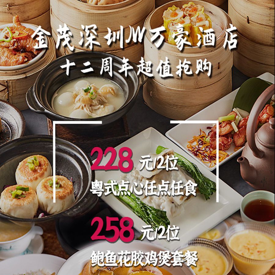 十二周年大促限时抢!¥114起,5折壕享『金茂深圳JW万豪酒店』粤式点心任点任食午餐(2套起订)/臻选下午茶/鲍鱼花胶鸡煲套餐!颜值高品质赞,吃货必囤!手慢无!