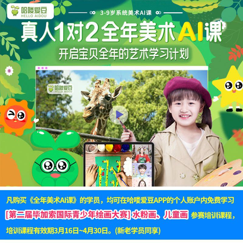 【限时返场 | 爱豆AI美术年课】包邮绘画材料礼盒+美术AI课50节+节日艺术课30节+家庭艺术空间创造课20节,分龄系统学习一整年,专业美院名师面对面互动学习