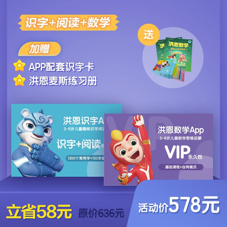 【洪恩识字永久组合包+数学永久包】立省58元+APP配套识字卡+洪恩麦斯练习册丨识字、阅读、数学,双科助力幼小衔接,轻松且快乐!
