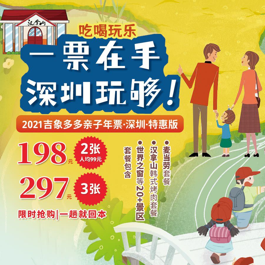 人均99元,轻松畅玩20家景区!世界之窗免费玩,汉拿山韩式烤肉、麦当劳免费吃!¥198买1送1,速抢《2021吉象多多亲子年票·深圳·特惠版》!吃喝玩乐全都有,一趟就值回票价!