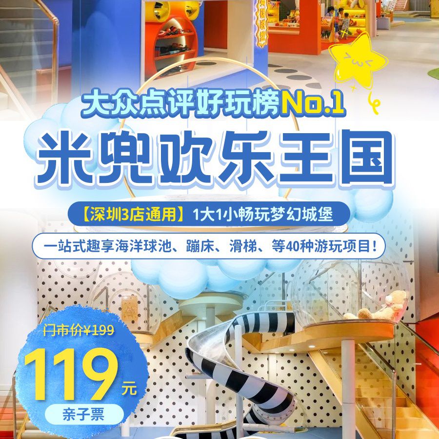 【深圳3店通用】大众点评好玩榜No.1!爆款返场,疯抢价¥119/1大1小,全天不限时畅玩2000㎡+梦幻城堡『米兜欢乐王国』,一站式趣享海洋球池、蹦床、滑梯、等40种游玩项目!