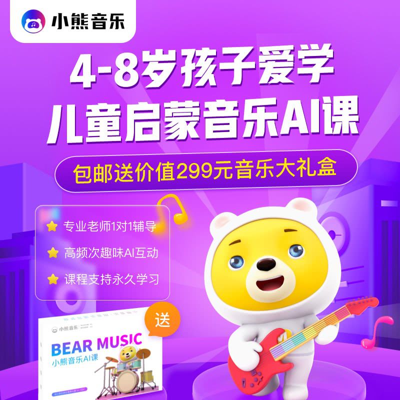 【新品首发!包邮送超值音乐大礼盒(内含2个小熊打击乐器)】小熊音乐,8节AI互动启蒙课+两周社群专业导师辅导,高频次趣味AI互动,适合4-8岁零基础音乐启蒙