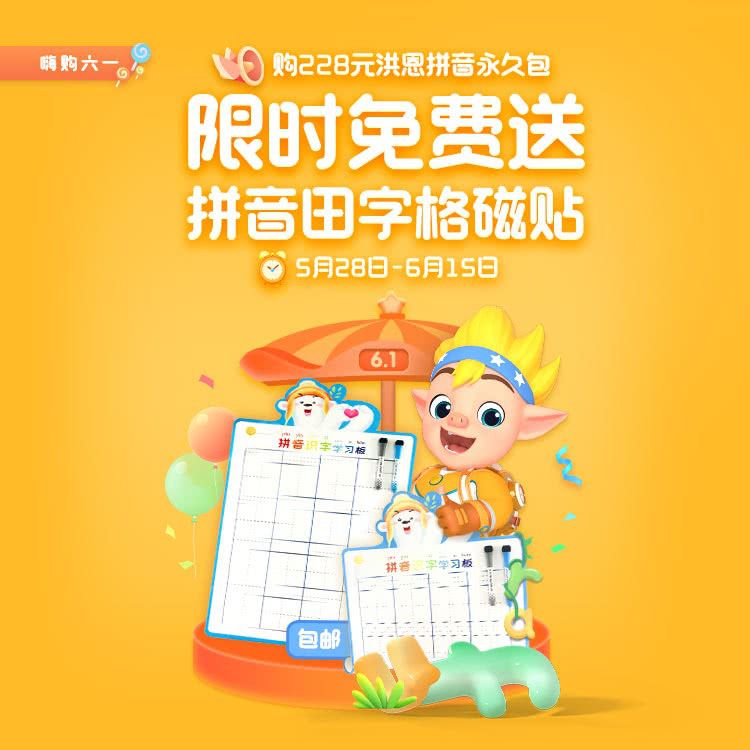 【六一惊喜丨限时赠价值58元拼音田字格磁贴】洪恩拼音拼读永久包,幼小衔接必备,一拼音一儿歌交互学习,科学语音测评系统,教学课程同步部编版小学语文课本!