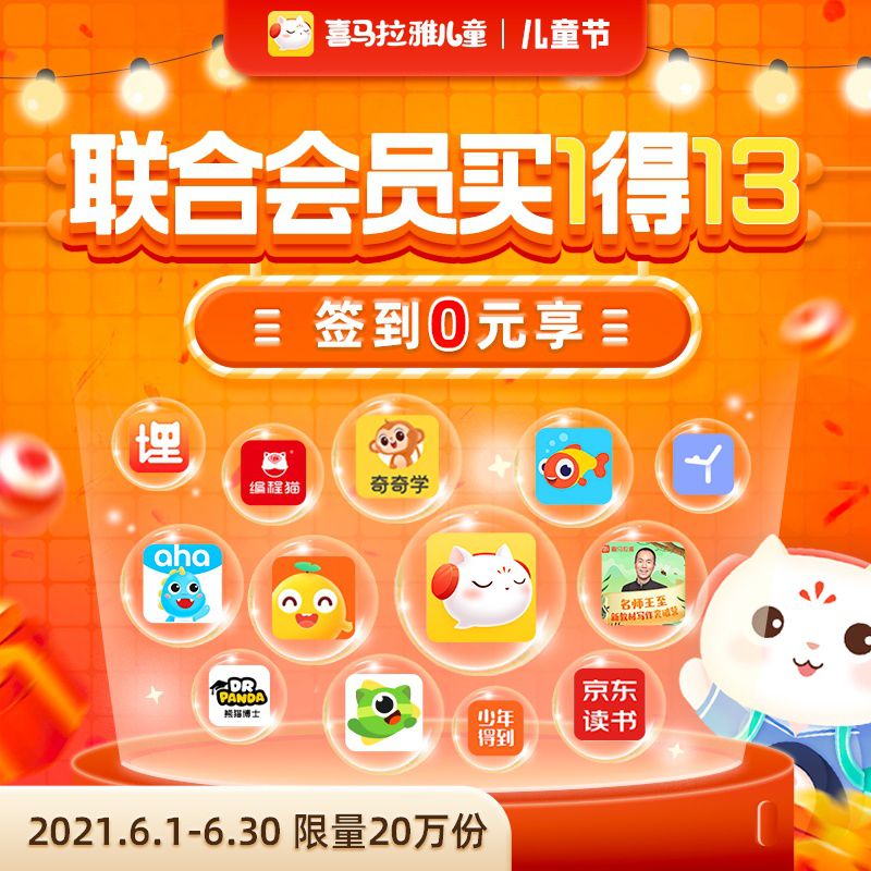 【儿童节限定活动 | 买1得13】喜马拉雅儿童会员2年卡·签到0元学,享13大联合会员权益!爆款专辑+优质绘本+热门视频课,语数英百科齐全,适合0~12岁!