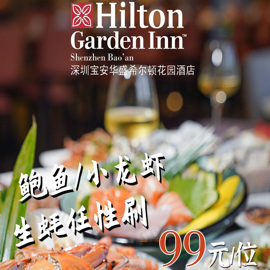 【节假日通用】生蚝+鲍鱼+北极贝畅享!¥99/位,抢『深圳宝安华盛希尔顿花园酒店』自助晚餐!10+档口100+菜品,香辣小龙虾/烤生蚝/盐焗海螺助阵,酒水畅饮嗨翻味蕾!