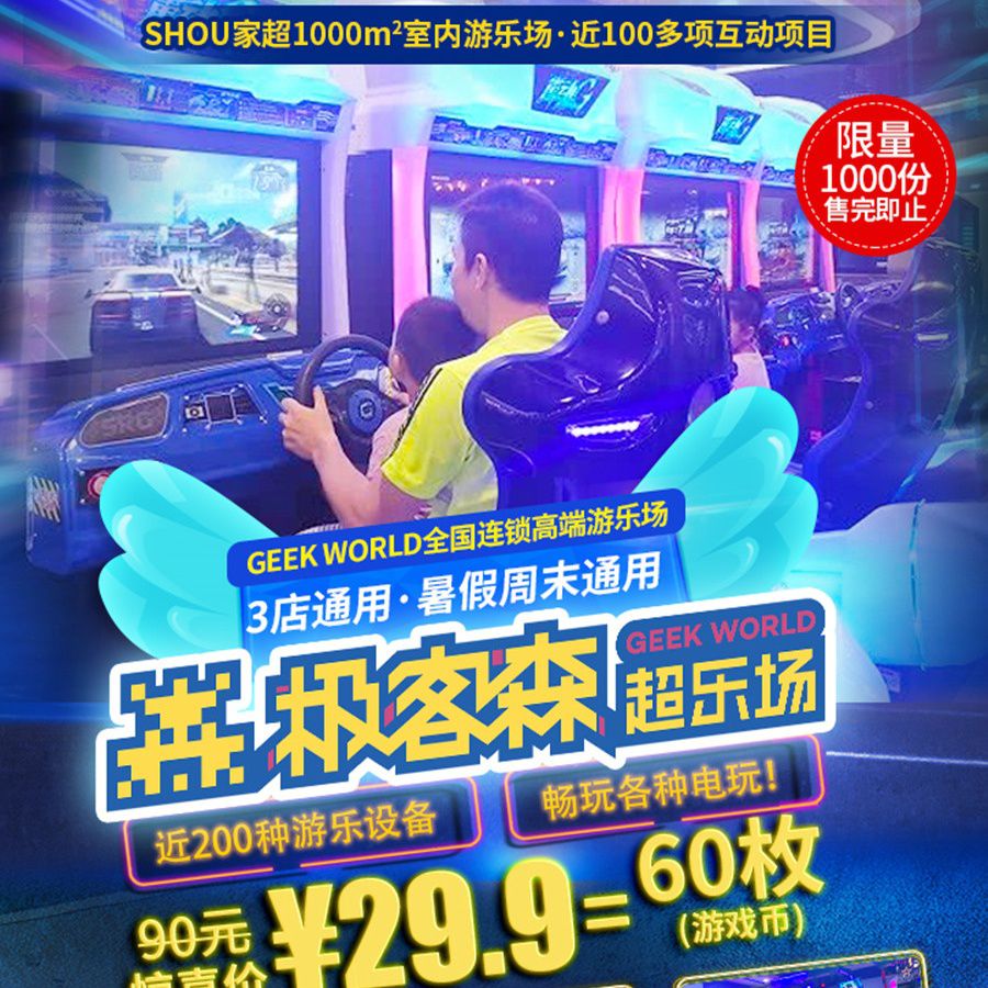【周末暑期&3店通用】¥29.9=『极客森超乐场』60枚游戏币,超1000㎡室内游乐场,畅玩近200种游乐设备,100项互动项目,疯玩一整天!