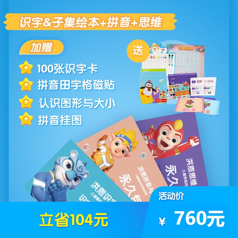 【洪恩组合会员88折丨永久包】识字子集绘本➕拼音➕思维,赠识字卡100张+拼音田字格磁贴+拼音挂图+认识图形与大小