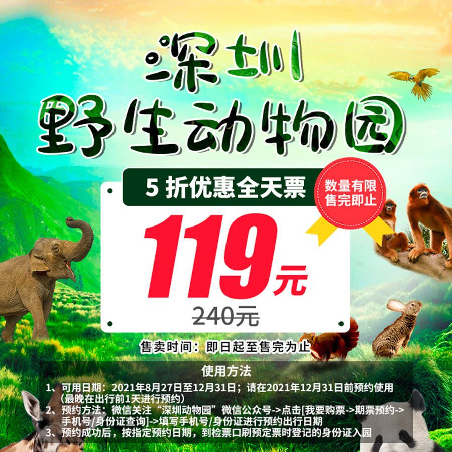 5折钜惠,售完即止!¥119抢全天票!玩转『深圳野生动物园』,畅游60多万㎡放养式园区,各地奇珍异兽齐聚一堂,赴一场奇妙的动物王国探索之旅!