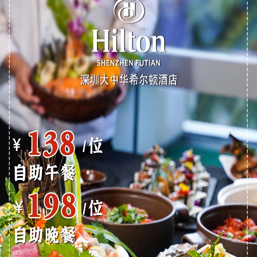 实现福田CBD酒店大餐自由!¥138起壕享【深圳大中华希尔顿酒店】自助午/晚餐,晚餐派送生蚝配鱼子酱&法式鹅肝、畅吃小龙虾&10+种海鲜刺身等,环球美味一次全get!有效期至年底~