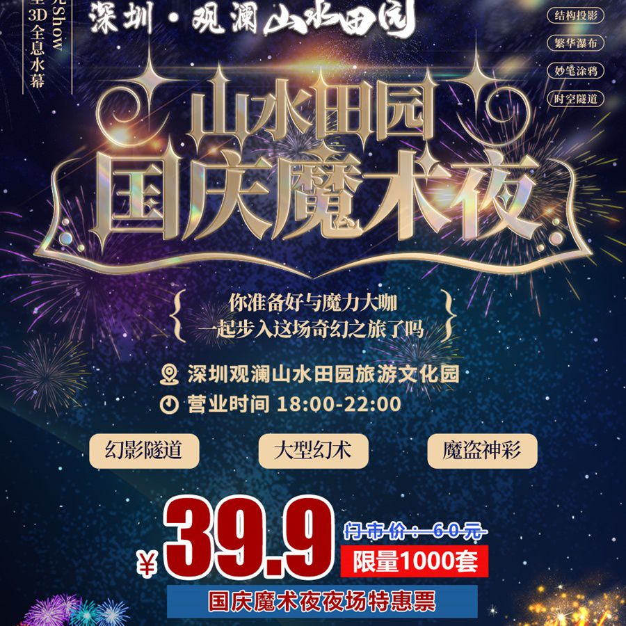 山水田园,国庆魔术夜!¥39.9夜游观澜山水田园,首届《奇幻魔术夜》来袭!90分钟超长演艺,幻影隧道、大型幻术、魔盗神彩…还能赏山水奇幻夜灯光秀!