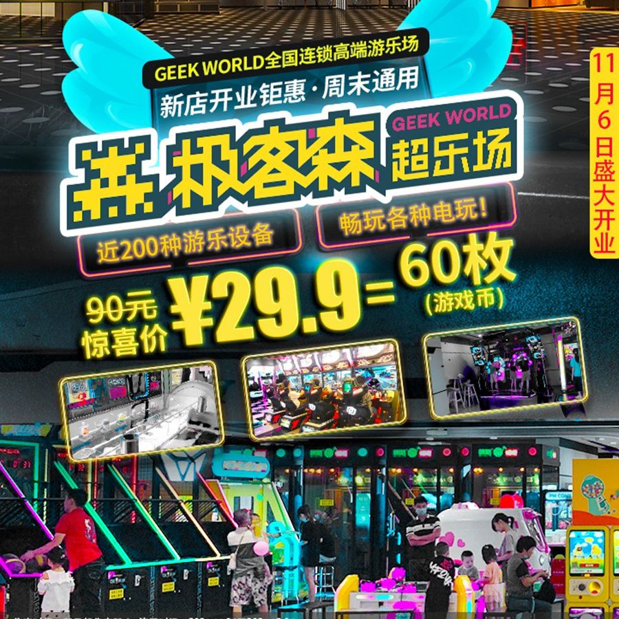新店开业钜惠!¥29.9=极客森超乐场(宝能环球汇店)60枚游戏币,周末通用!1200㎡室内游乐场,畅玩近200多种游戏设备,100项互动项目,大小朋友疯玩一整天!