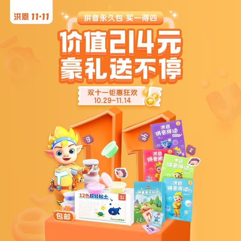 【10.29-11.14丨包邮送12色超轻粘土+拼音对战棋+拼音练习册】洪恩拼音拼读永久包,拼音儿歌交互,锻炼孩子拼读、应用、书写等能力!
