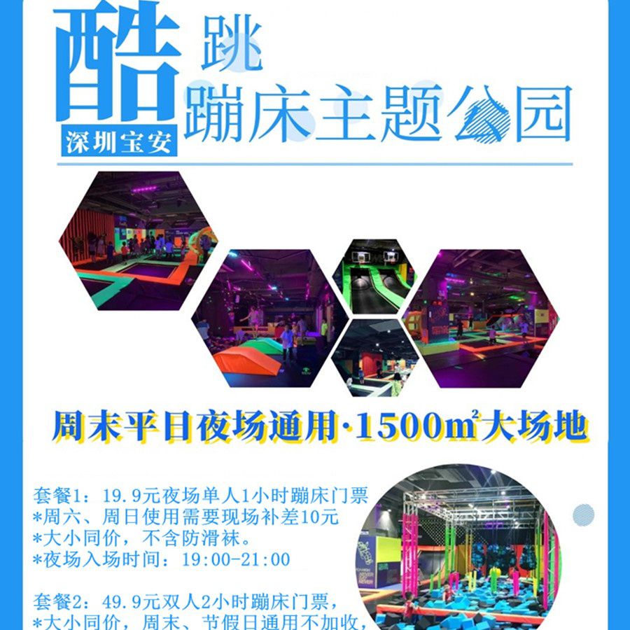 【双11大促】¥19.9起限时抢夜场/双人票!宝安·酷跳蹦床主题公园:1500㎡超大面积,一站式趣享自由蹦床区+海绵池+灌篮区等,快来燃烧你的卡路里!周末通用~