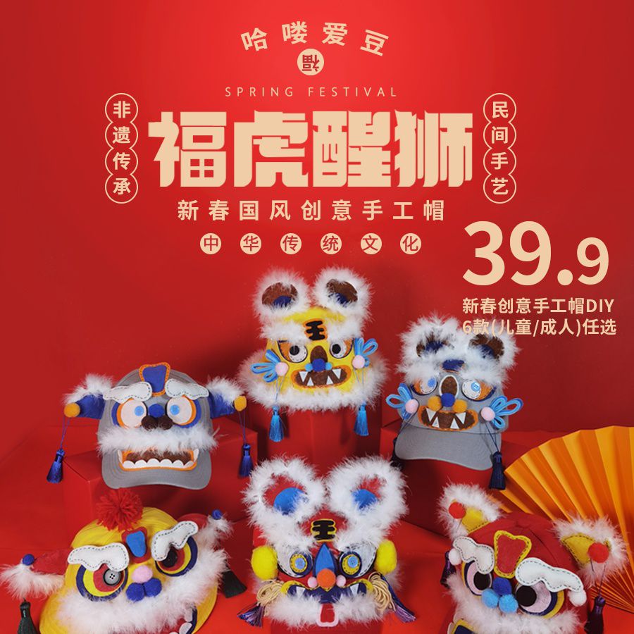 【限时39.9元】哈喽爱豆·福虎醒狮新春创意手工帽DIY,6款(儿童/成人)任选,高品帽子配各种手工艺材料+真绒毛、冰丝流苏…全家玩转国潮风