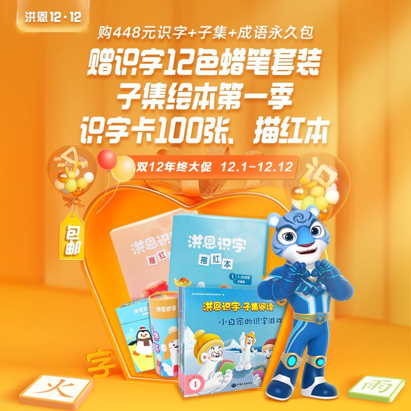 【12.1-12.12丨包邮送12色蜡笔+识字卡100张+描红本+子集绘本】洪恩永久识字包+子集绘本永久包+成语永久包,1300个常用汉字启蒙!