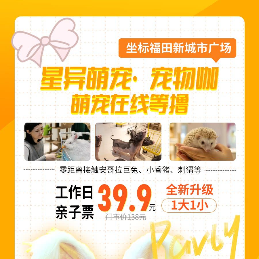 39.9元1大1小,萌宠在线等撸!火出圈【星异萌宠·宠物咖】全新升级,位于福田新城市广场!零距离接触安哥拉巨兔、小香猪、蜜袋鼯等,还能随手拍网红大片~