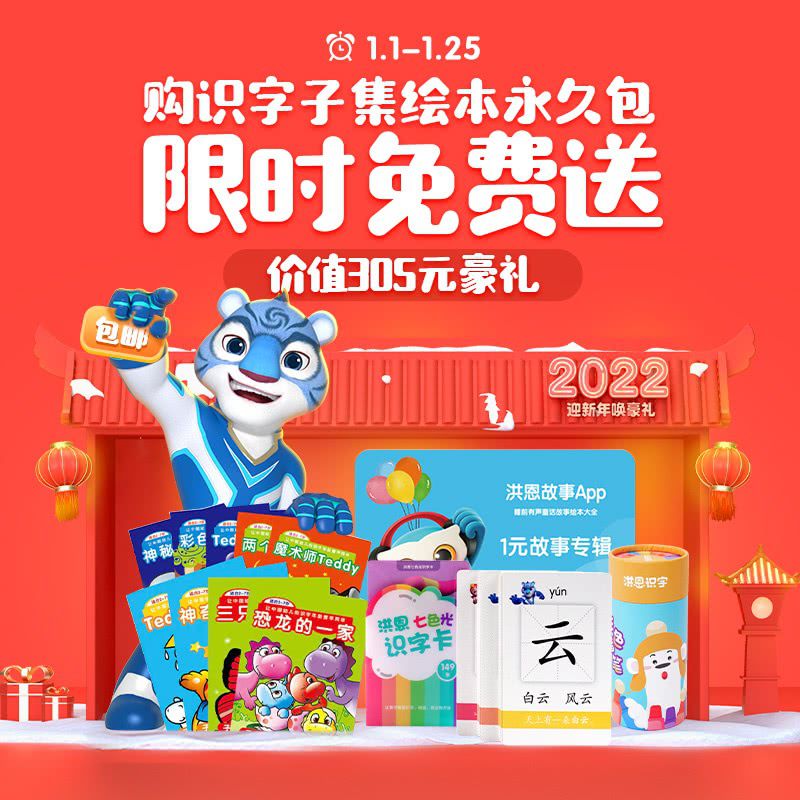 【迎新年1.1-1.25丨包邮七色光识字卡+子集扩展识字定制版+识字蜡笔+1元故事专辑】洪恩识字永久包+子集绘本永久包,含1300个高频常用汉字!