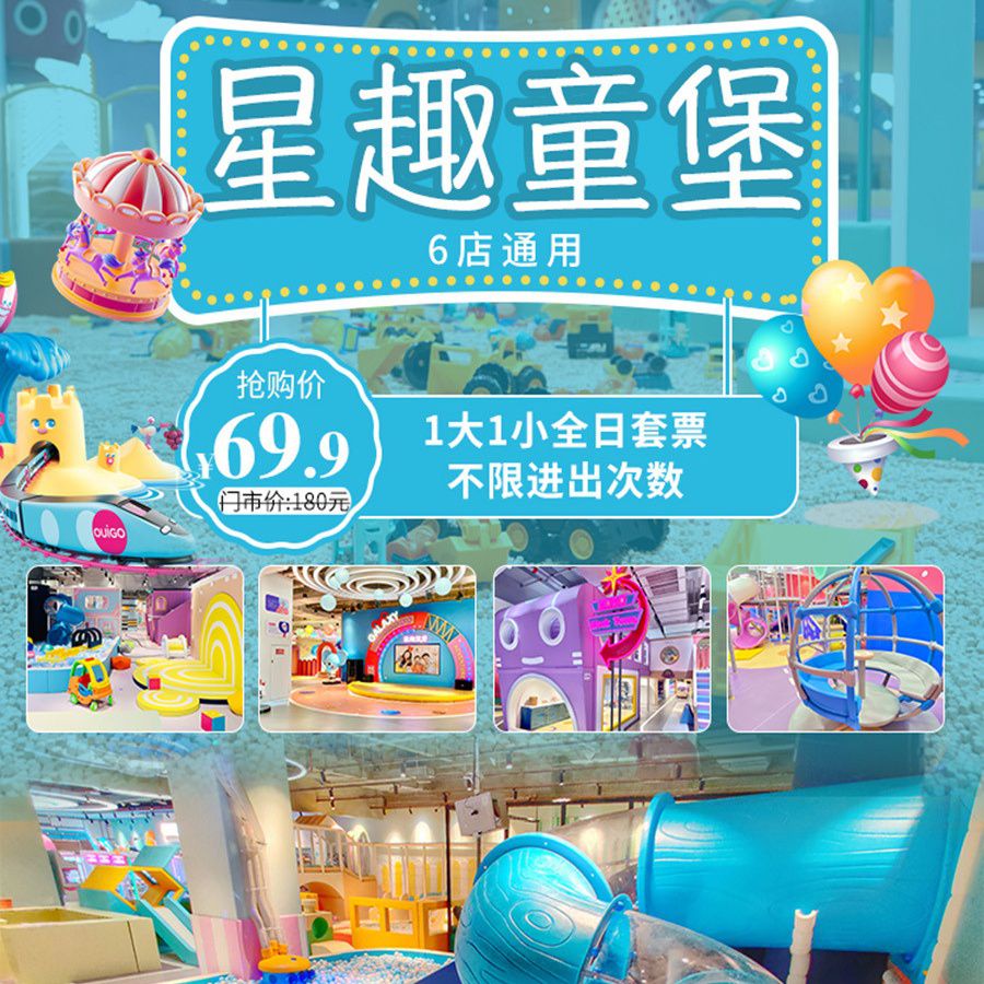 【6店任选·清明五一端午通用】1000+㎡星球主题乐园!¥69.9/1大1小,当天不限次进出星趣童堡!泡泡球池、趣味攀爬、玩具沙池....10大梦幻游乐区域,30+种花样玩法!