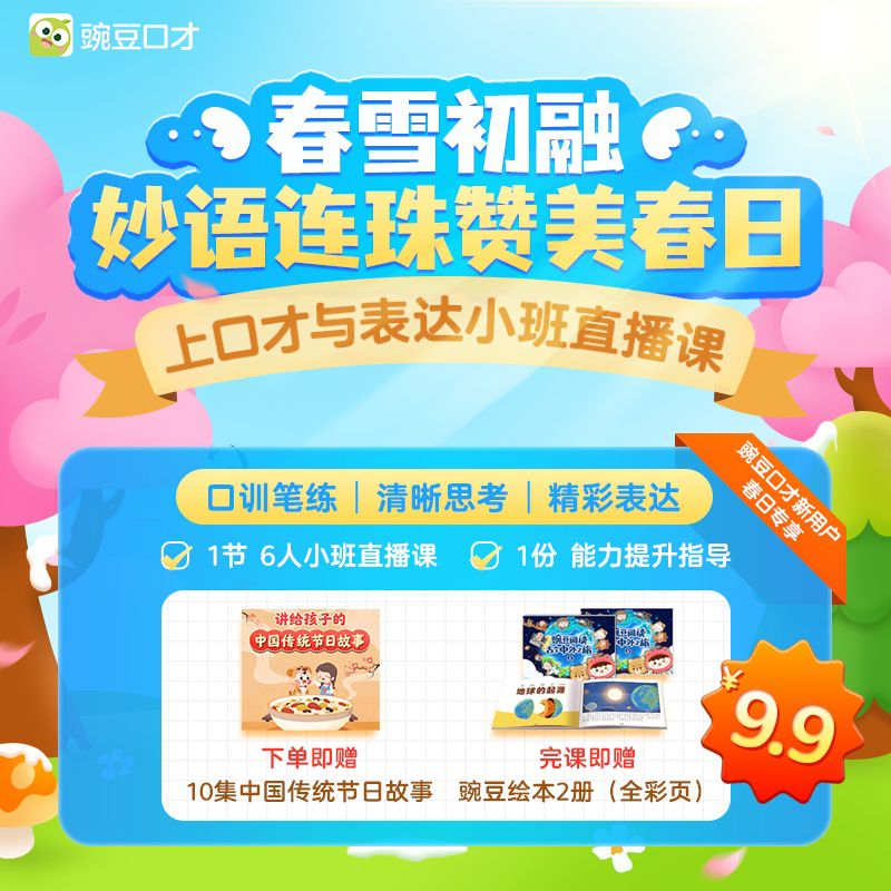 【完课送全彩豌豆绘本2册】豌豆口才教宝贝《妙语连珠赞美春日》,6人小班直播,培养口才与表达能力,再赠10集中国传统节日故事