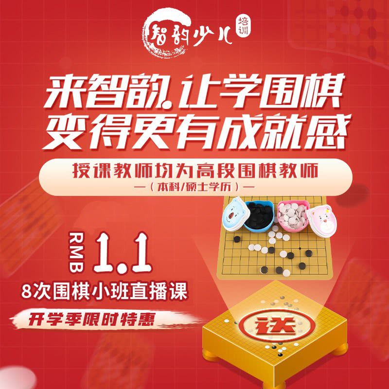 【开学季限时特惠 | ¥1.1抢8次课】完课赠送棋盘棋子1套!智韵围棋,精品小班直播课,故事性十足的视频互动,在趣味中学习围棋知识,再送弈客少儿VIP一个月