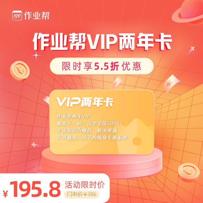 【2月21日-3月4日丨开学季特惠5.5折】作业帮两年卡VIP,覆盖小、初、高全学段5000+主流知识点概念,解决难题、告别题海,孩子的随身专属家教!