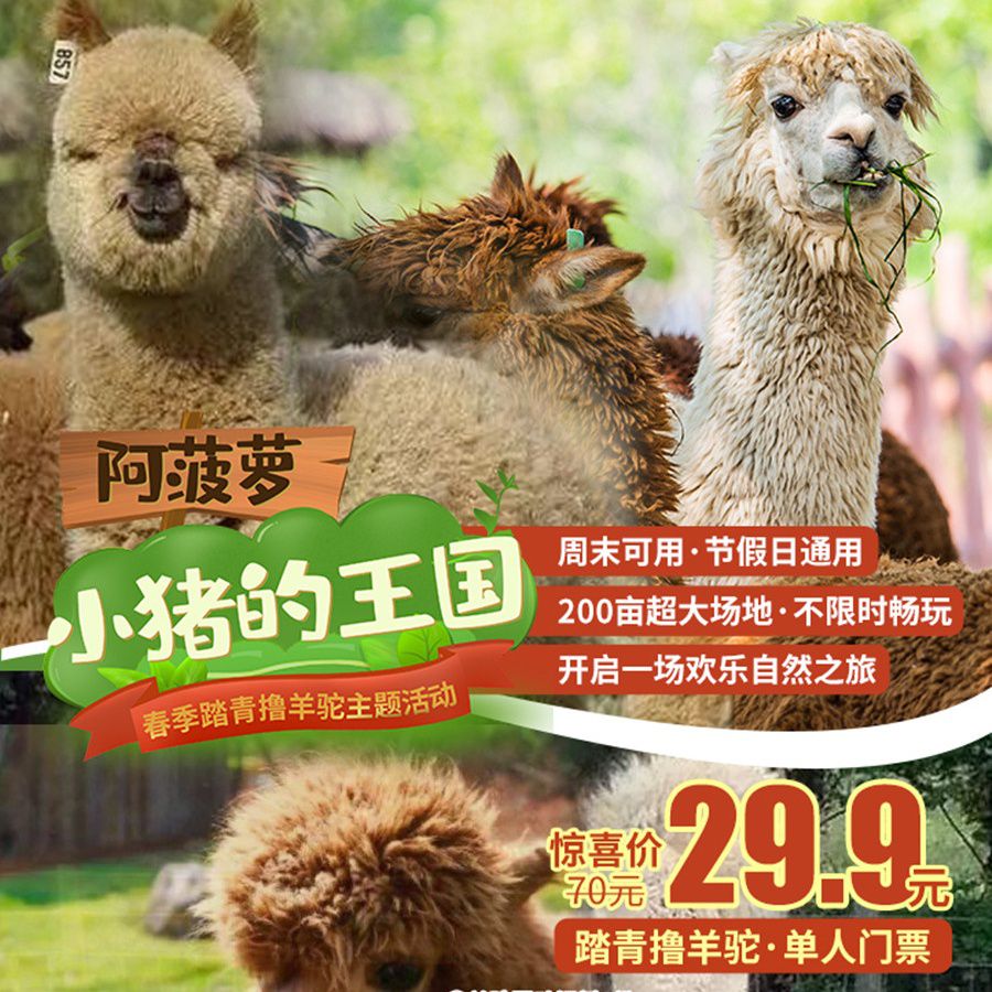 春季踏青撸羊驼!¥29.9不限时畅玩【阿菠萝小猪的王国】!200亩超大户外乐园,小猪运动会/套鸭子/旱地滑雪等趣味项目,赠羊驼互动饲料,开启欢乐自然之旅!